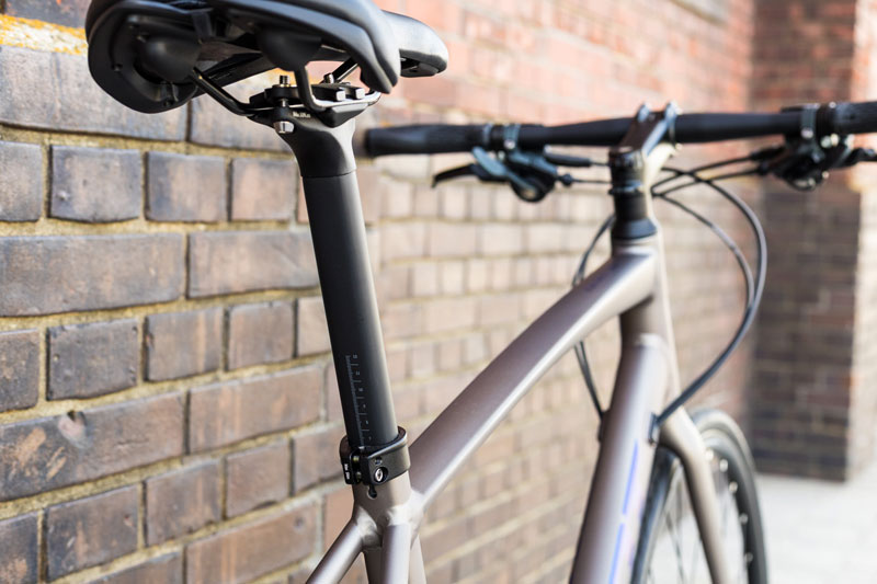 後端が直線的な「D」型断面形状のシートポスト。縦方向にはしなり易く、相対的に横方向の剛性感が高まるため、快適かつ素直な乗り味を実現します