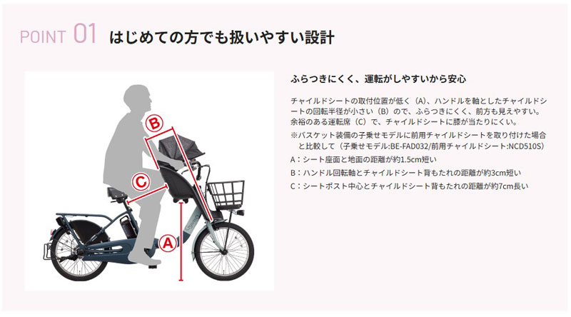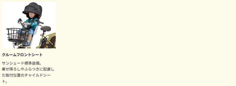 パナソニックの電動アシスト自転車に搭載されている、ベビー用品メーカーコンビと共同開発した「クルームフロントシート」。ふらつきにくく前方も見えやすい快適性を実現したチャイルドシートです。