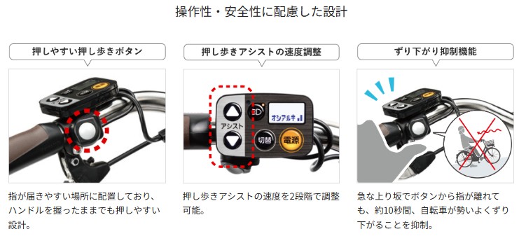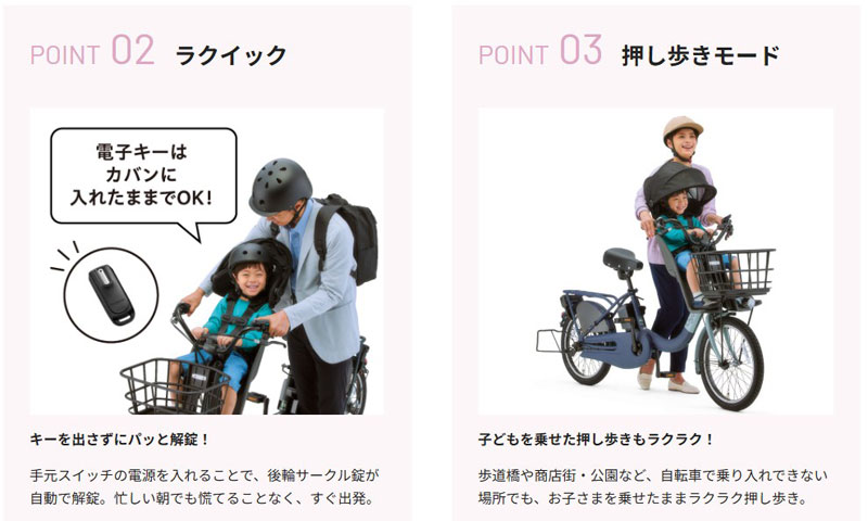 【押し歩きモード搭載】歩道橋や商店街・公園など、自転車で乗り入れできない場所でも、お子さまを乗せたままラクラク押し歩き。