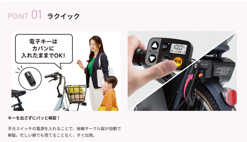 パナソニックの電動アシスト自転車に搭載している「ラクイック」は、電子キーをカバンに入れたまま、電源ボタンを押すだけで自動で解錠します。