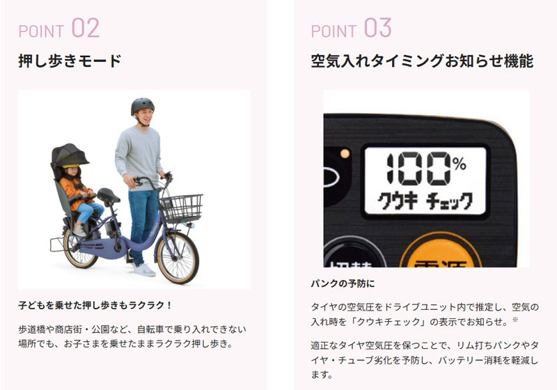 「空気入れタイミングお知らせ機能」は、安全・快適な走行をサポートします。