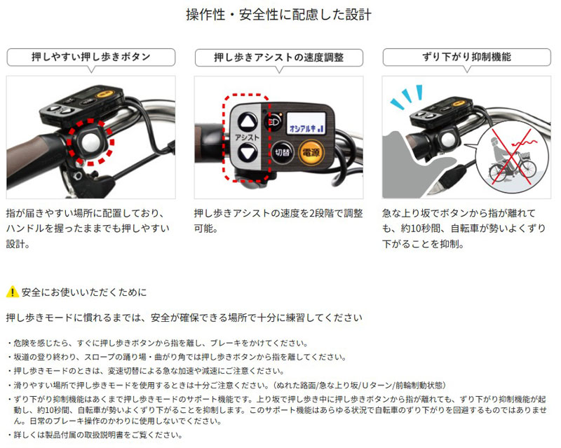 「押し歩きモード」は、モーターのアシストを活用して押し歩く際にかかる負荷を軽減!