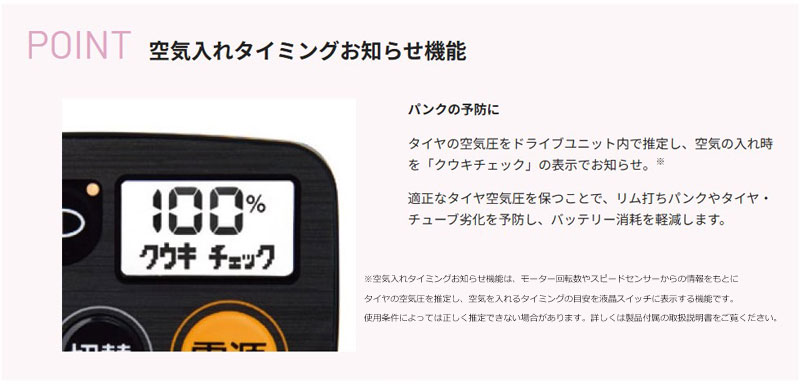 「空気入れタイミングお知らせ機能」は、安全・快適な走行をサポートします。