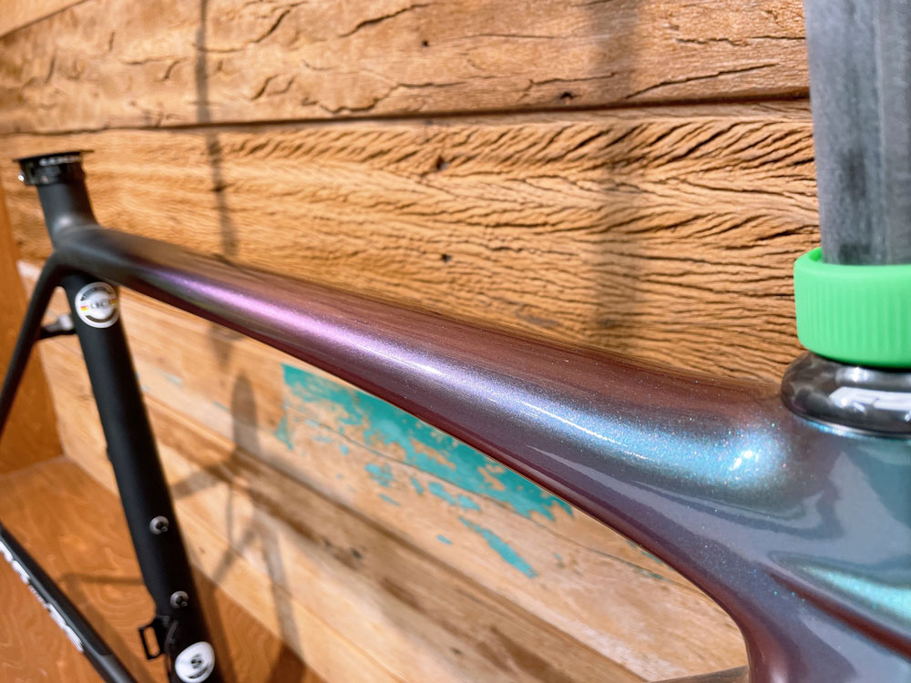 フレーム前方は艶有りカメレオンカラー、後方にいくにしたがい、つや消しブラックへグラデーションしていく、高級のあるカラーリングです。 -