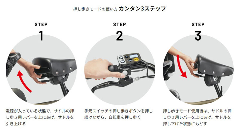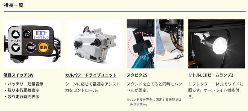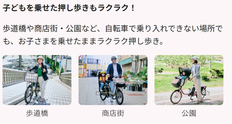 パナソニックの電動アシスト自転車に搭載している「スタピタ2S」は、スタンドを立てると、ハンドルも同時にロックします。スタピタなら、ハンドルがふらつきにくい構造なので、お子さまの乗せ降ろしがしやすく、とても便利です。