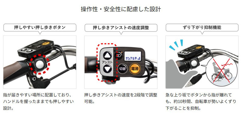 坂道では力強く、平地ではやさしくアシスト。こぎ出しは急発進を防ぎます。